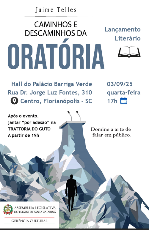 A Assembleia Legislativa de Santa Catarina, por proposição do deputado Ivan Naatz, promove no dia 3 de setembro de 2025 o lançamento do livro Caminhos e Descaminhos da Oratória, de autoria de Jaime Telles.