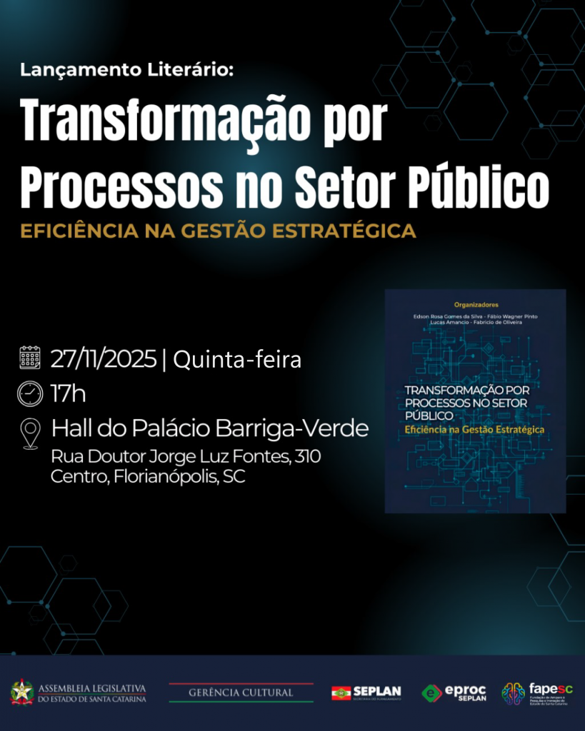 Lançamento Literário – Transformação por Processos no Setor Público Serviço📆 27 de novembro de 2025 🕐 17h 📍 Hall do Palácio Barriga Verde Rua Dr Jorge Luz Fontes, 310 Centro, Florianópolis – SCSobre o evento 👉 Confira a matéria completa: