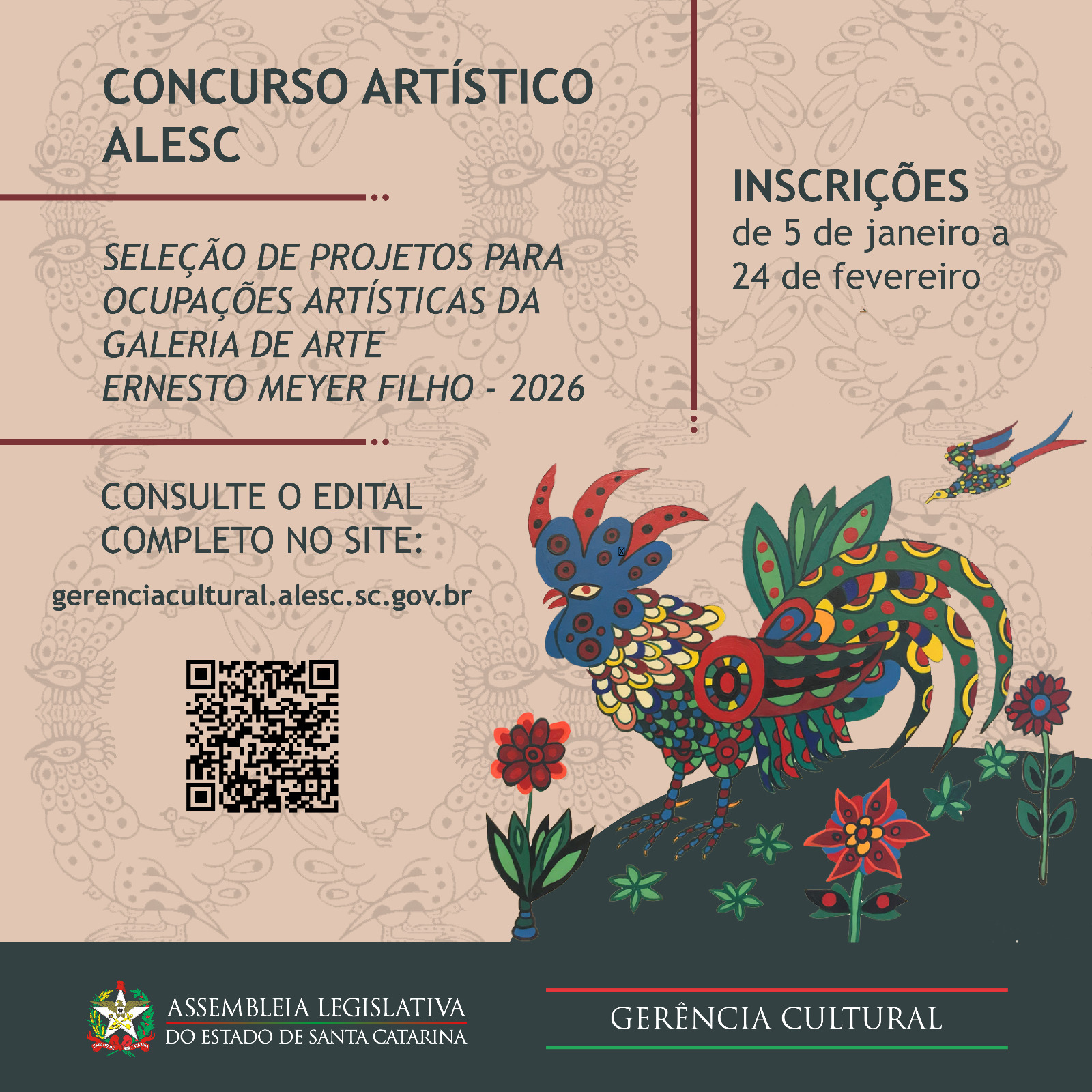 Podem participar artistas brasileiros ou estrangeiros em situação regular no país, com propostas contendo de 10 a 20 obras, exceto trabalhos de arte generativa, performance ou criados com inteligência artificial. O edital completo, anexos e orientações estão disponíveis As inscrições são gratuitas e devem ser feitas a partir do dia 05 de janeiro até 24 de fevereiro de 2026 no site gerenciacultural.alesc.sc.gov.br